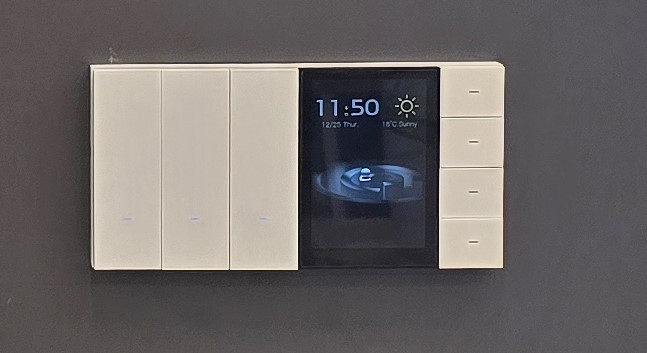 در تصویر یک عدد تاچ پنل و در سمت چپ آن یک کلید سه پل فشاری بصورت پیانویی یکسره کنار هم نصب شده اند.